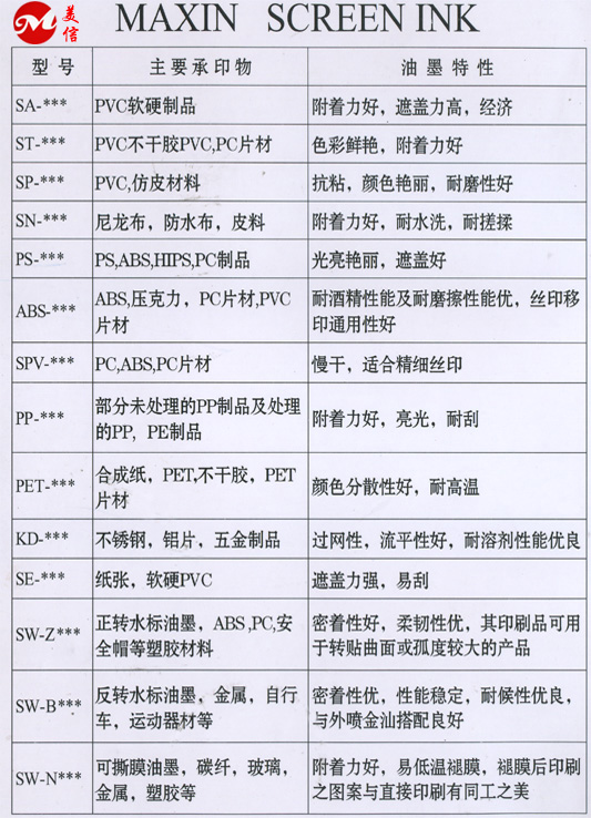 美信油墨特性图表